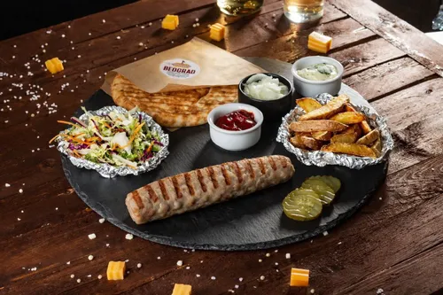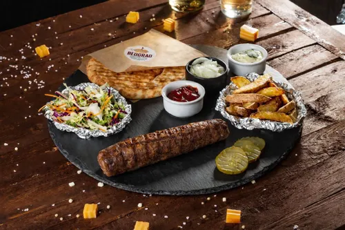 Медальоны из рубленой говядины и свинины с кусочками сыра внутри и ярким кайенским перцем. Подается со свежими помидорами и огурцами, салатом Коул Слоу (капуста пекинская, капуста красная, морковь) маринованным луком, двумя видами соусов сальса и тартар и булочкой в сербском стиле.